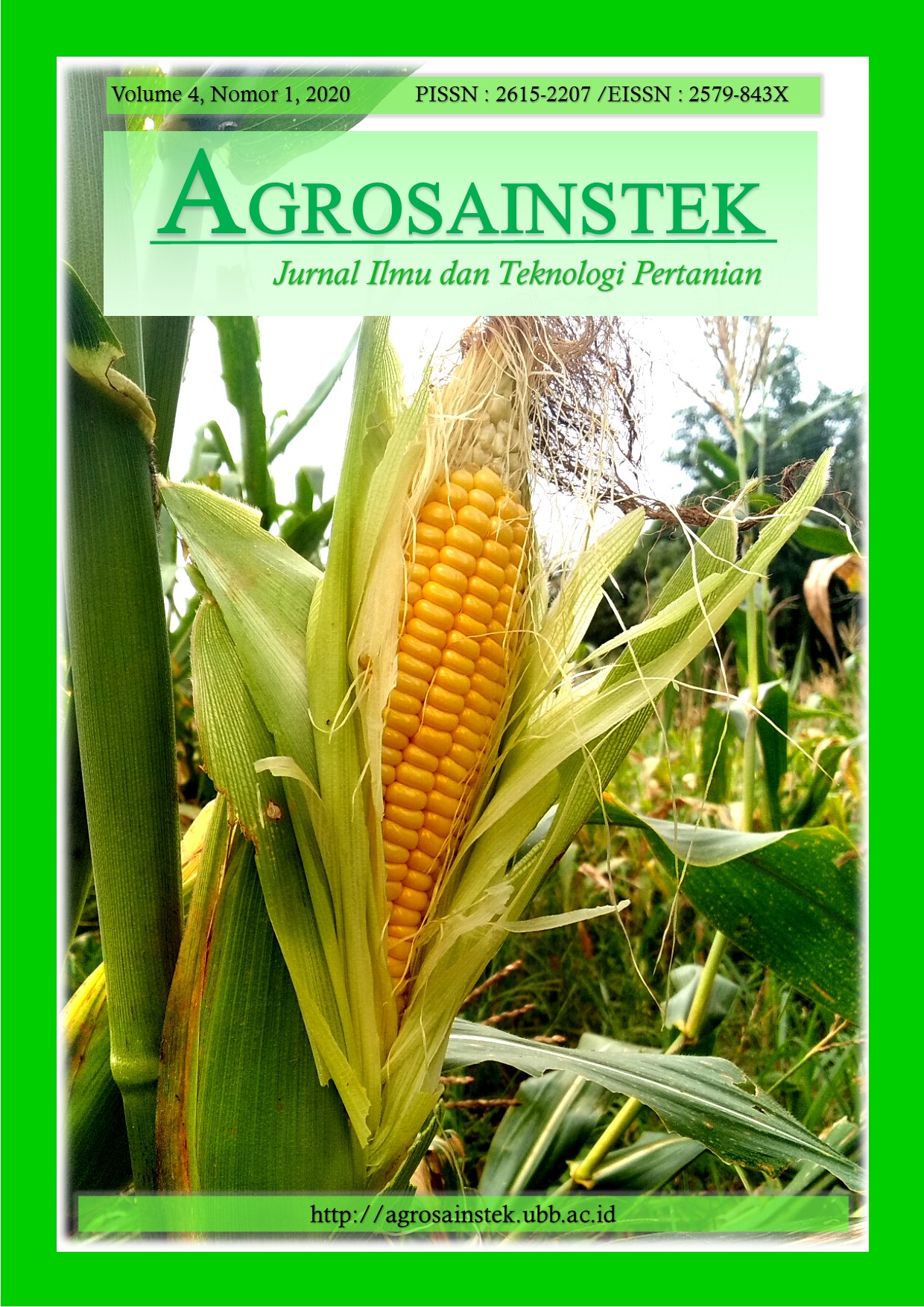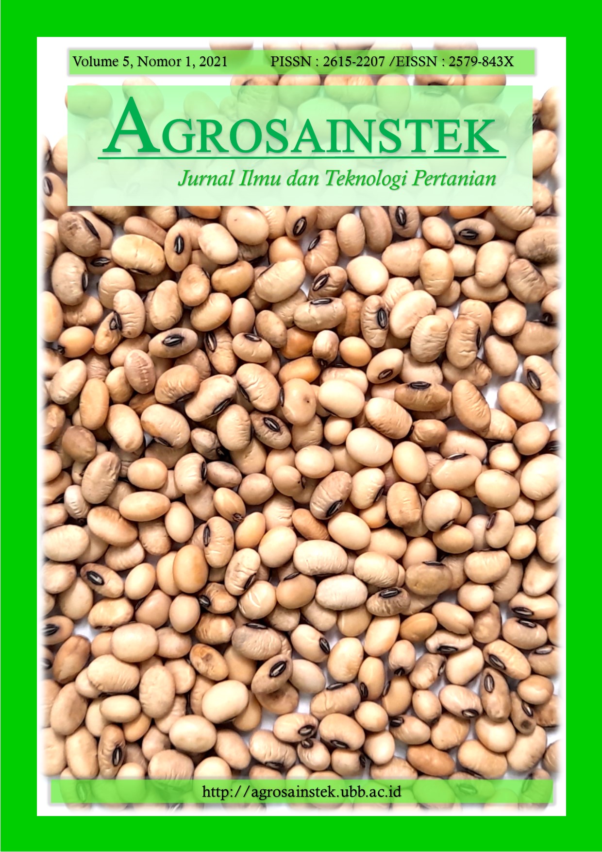 Vol. 5 No. 1 (2021)AGROSAINSTEK: Jurnal Ilmu dan Teknologi Pertanian (AGROSAINSTEK: Journal of Agricultural Science and Technology) is a journal that publishes research articles, review articles, and research notes related to agrotechnology, including all their interfaces, in both Bahasa and English. The published fields consist of plant cultivation, plant breeding, plant ecophysiology, seed science, land agriculture, post-harvest, plant pests and diseases, weeds, agricultural technology, and agricultural biotechnology. AGROSAINSTEK: Jurnal Ilmu dan Teknologi Pertanian journal is published twice a year in every June and December. This journal collaborates with Indonesian Society for Agronomy (PERAGI) Chapter Bangka Belitung.