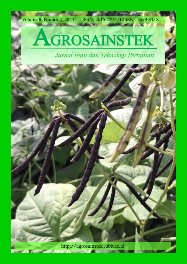 Vol. 8 No. 1 (2024)AGROSAINSTEK: Jurnal Ilmu dan Teknologi Pertanian (AGROSAINSTEK: Journal of Agricultural Science and Technology) is a journal that publishes research articles, review articles, and research notes related to agrotechnology, including all their interfaces, in both Bahasa and English. The published fields consist of plant cultivation, plant breeding, plant ecophysiology, seed science, land agriculture, post-harvest, plant pests and diseases, weeds, agricultural technology, and agricultural biotechnology. AGROSAINSTEK: Jurnal Ilmu dan Teknologi Pertanian journal is published twice a year in every June and December. This journal collaborates with Indonesian Society for Agronomy (PERAGI) Chapter Bangka Belitung.
