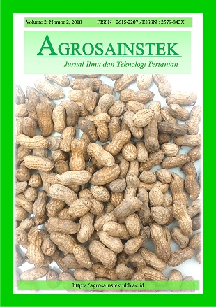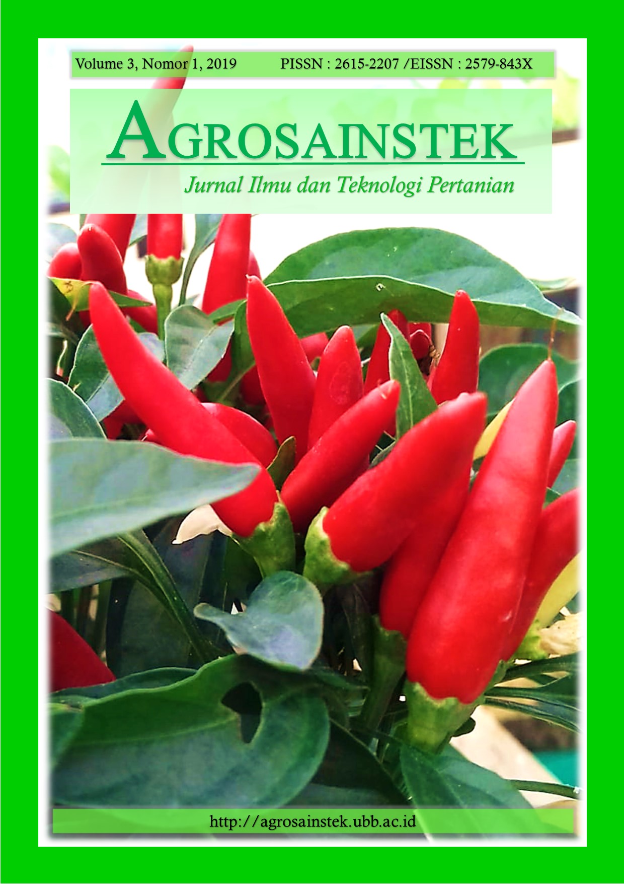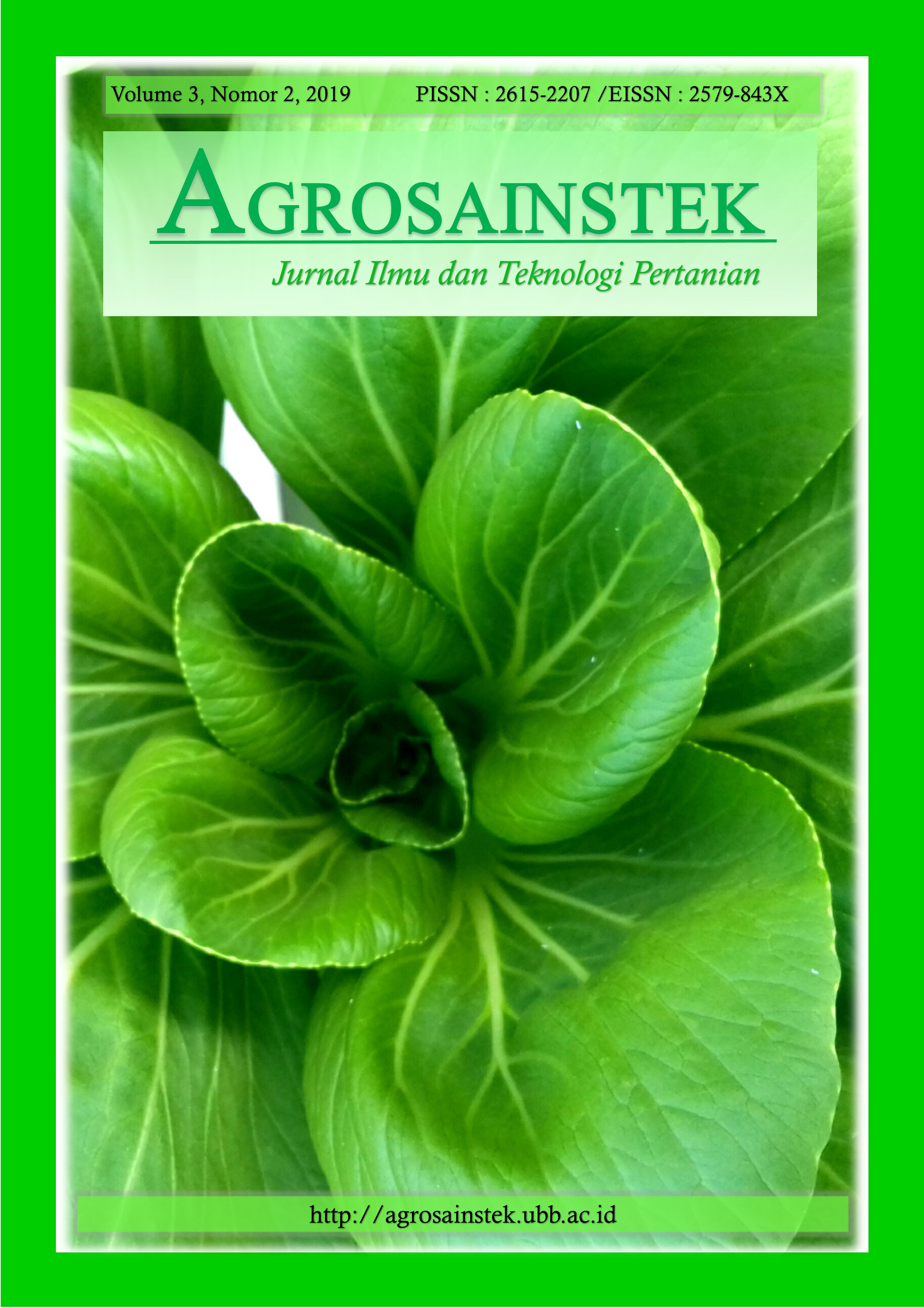 Vol. 3 No. 2 (2019)AGROSAINSTEK: Jurnal Ilmu dan Teknologi Pertanian (AGROSAINSTEK: Journal of Agricultural Science and Technology) is a journal that publishes research articles, review articles, and research notes related to agrotechnology, including all their interfaces, in both Bahasa and English. The published fields consist of plant cultivation, plant breeding, plant ecophysiology, seed science, land agriculture, post-harvest, plant pests and diseases, weeds, agricultural technology, and agricultural biotechnology. AGROSAINSTEK: Jurnal Ilmu dan Teknologi Pertanian journal is published twice a year in every June and December. This journal collaborates with Indonesian Society for Agronomy (PERAGI) Chapter Bangka Belitung.