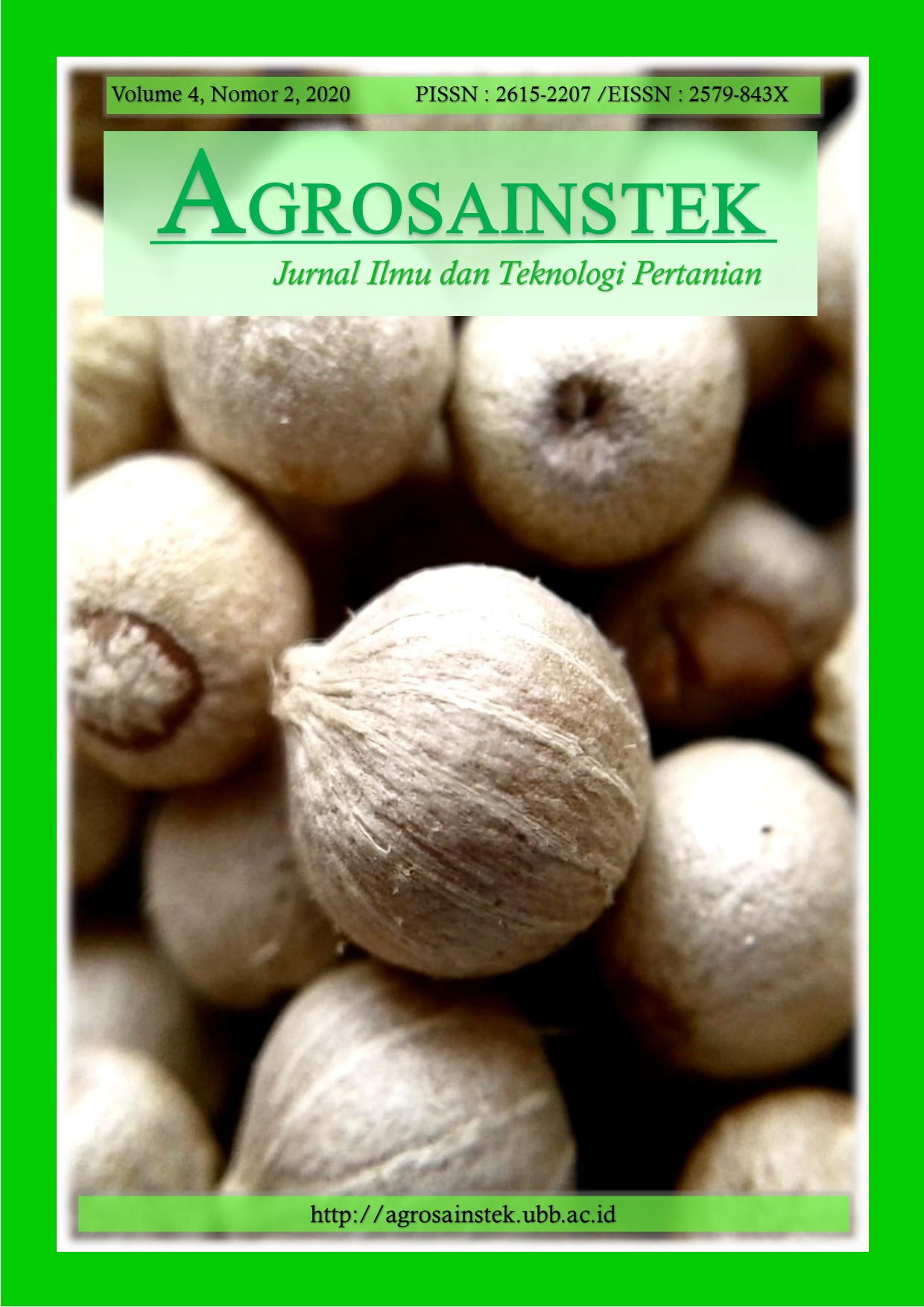 Vol. 4 No. 2 (2020)AGROSAINSTEK: Jurnal Ilmu dan Teknologi Pertanian (AGROSAINSTEK: Journal of Agricultural Science and Technology) is a journal that publishes research articles, review articles, and research notes related to agrotechnology, including all their interfaces, in both Bahasa and English. The published fields consist of plant cultivation, plant breeding, plant ecophysiology, seed science, land agriculture, post-harvest, plant pests and diseases, weeds, agricultural technology, and agricultural biotechnology. AGROSAINSTEK: Jurnal Ilmu dan Teknologi Pertanian journal is published twice a year in every June and December. This journal collaborates with Indonesian Society for Agronomy (PERAGI) Chapter Bangka Belitung.